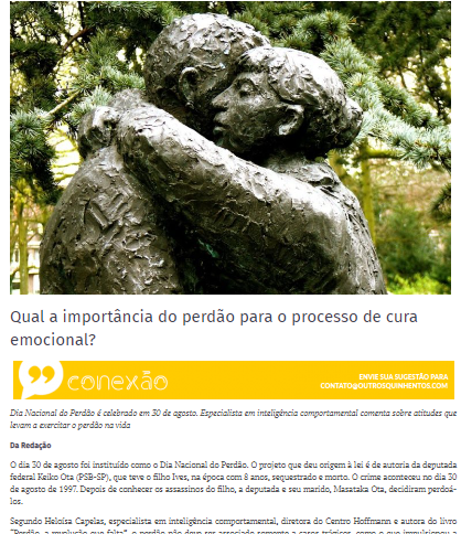 "Segundo Heloísa Capelas, especialista em inteligência comportamental, diretora do Centro Hoffman e autora do livro “Perdão, a revolução que falta”, o perdão não deve ser associado somente a casos trágicos,, mas sim a um processo que deve ser praticado diariamente".Leia entrevista com Heloísa Capelas.