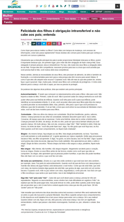 Em artigo publicado pelo Portal Bonde, de Londrina (PR), Heloísa Capelas dá dicas para quem busca melhorar a educação dos filhos e afirma: "pai e mãe não têm a obrigação de fazer a criança feliz".
