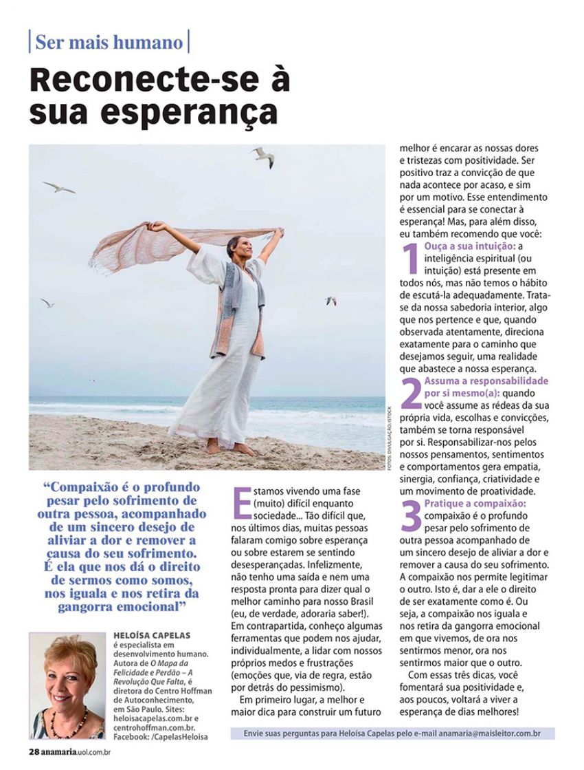 A maior dica para construir um futuro melhor e reencontrar a esperança é encarar nossas dores e tristezas com positividade. Veja o artigo de Heloísa Capelas para a revista "Ana Maria". Clique aqui para visualizar em PDF.